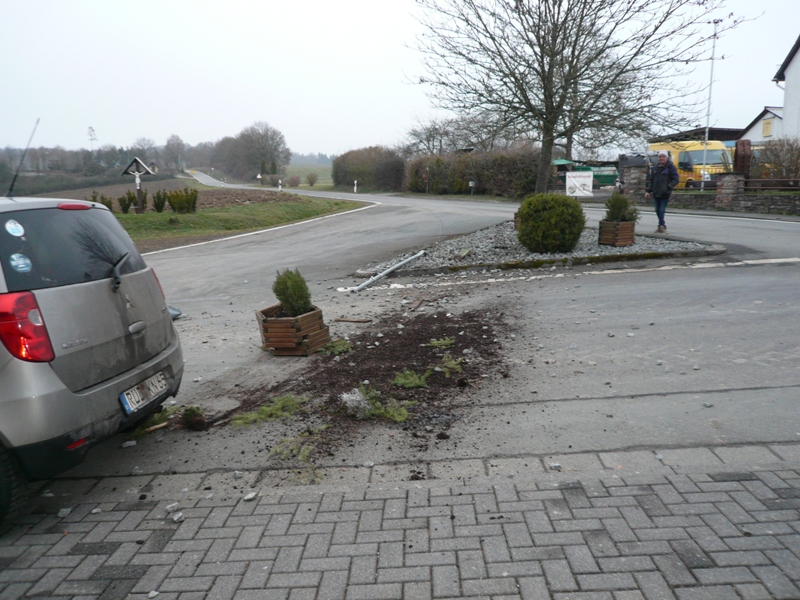 Ein Autofahrer ist lt. Anwohner gegen ca. 4 Uhr in der Nacht über die Verkehrsinsel gefahren. 30 m Bremsspur haben anscheinend nicht ausgereicht um Richtung Friedhof abzubiegen. Die Feuerwehr wurde verständigt um die Trümmer zu beseitigen.
