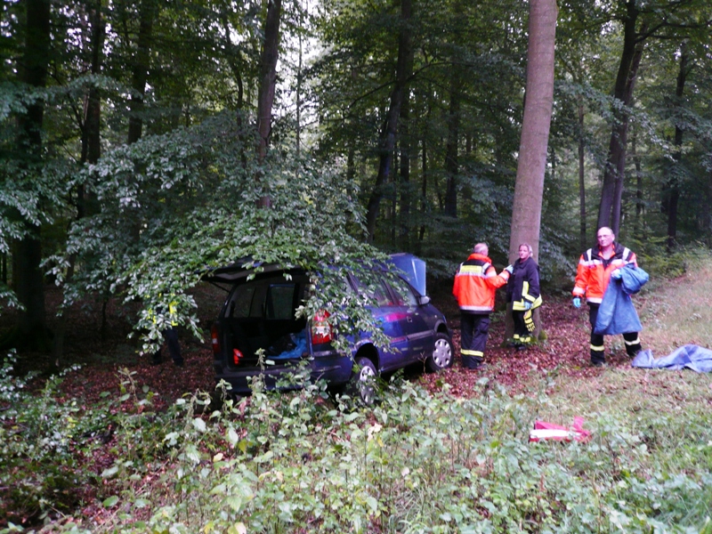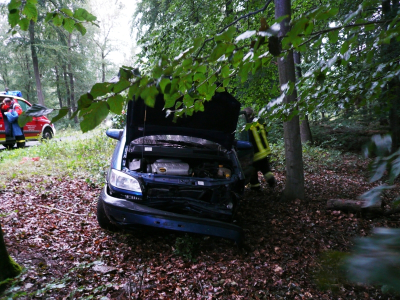 Auf der Landstraße zwischen Wollmerschied und Rettershein der L3397 (Landesgrenze) kam ein PKW von der Fahrbahn ab. Das Fahrzeug wurde abrupt durch einen Baumstumpf im Wald gestoppt.